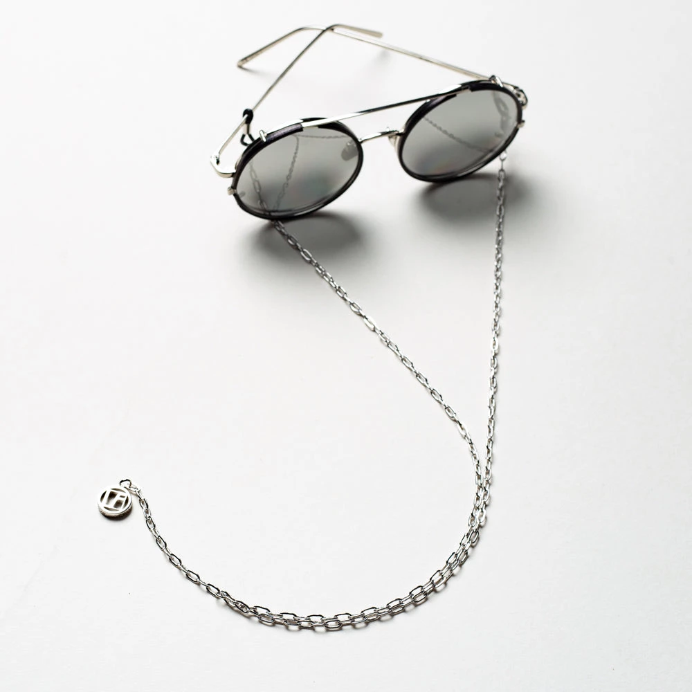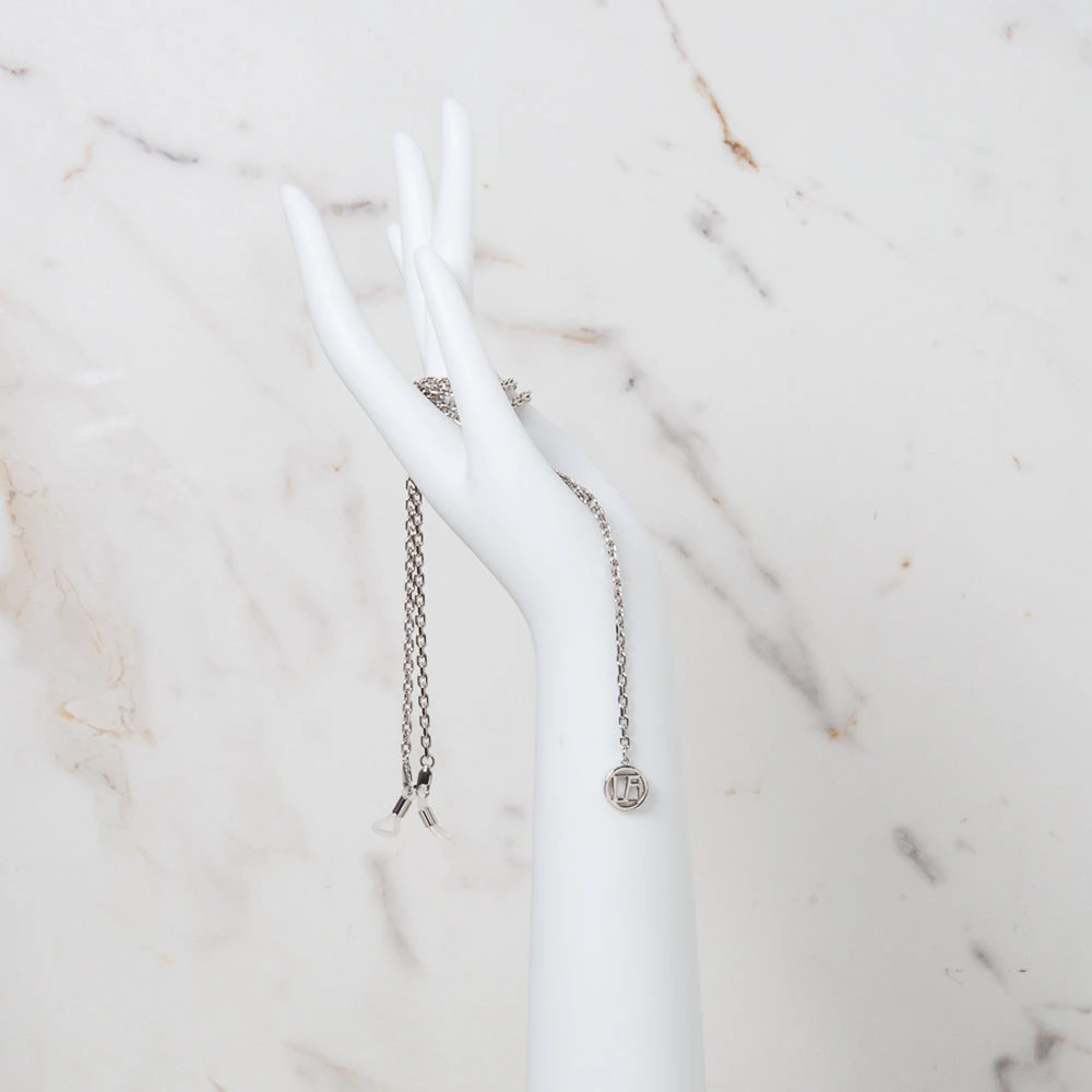A classic eyewear accessory, this stylish fine chain is created in resiliant brass and plated in signature Linda Farrow white gold. Adjustable rubber hooks are fitted at each end, allowing the chain to be paired with any of our titanium or acetate frames. The chain is also finished with a chic drop pendant bearing our ‘LF’ initials.