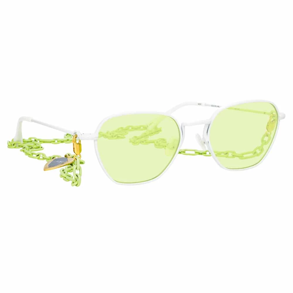Be charmed by these inimitable rectangular sunglasses from our collaboration with Alessandra Rich. Frames crafted from matte satin finished stainless steel and paired with chartreuse green lenses, they are elevated with a detachable chartreuse brass chain adorned with a two-tone heart charm.
