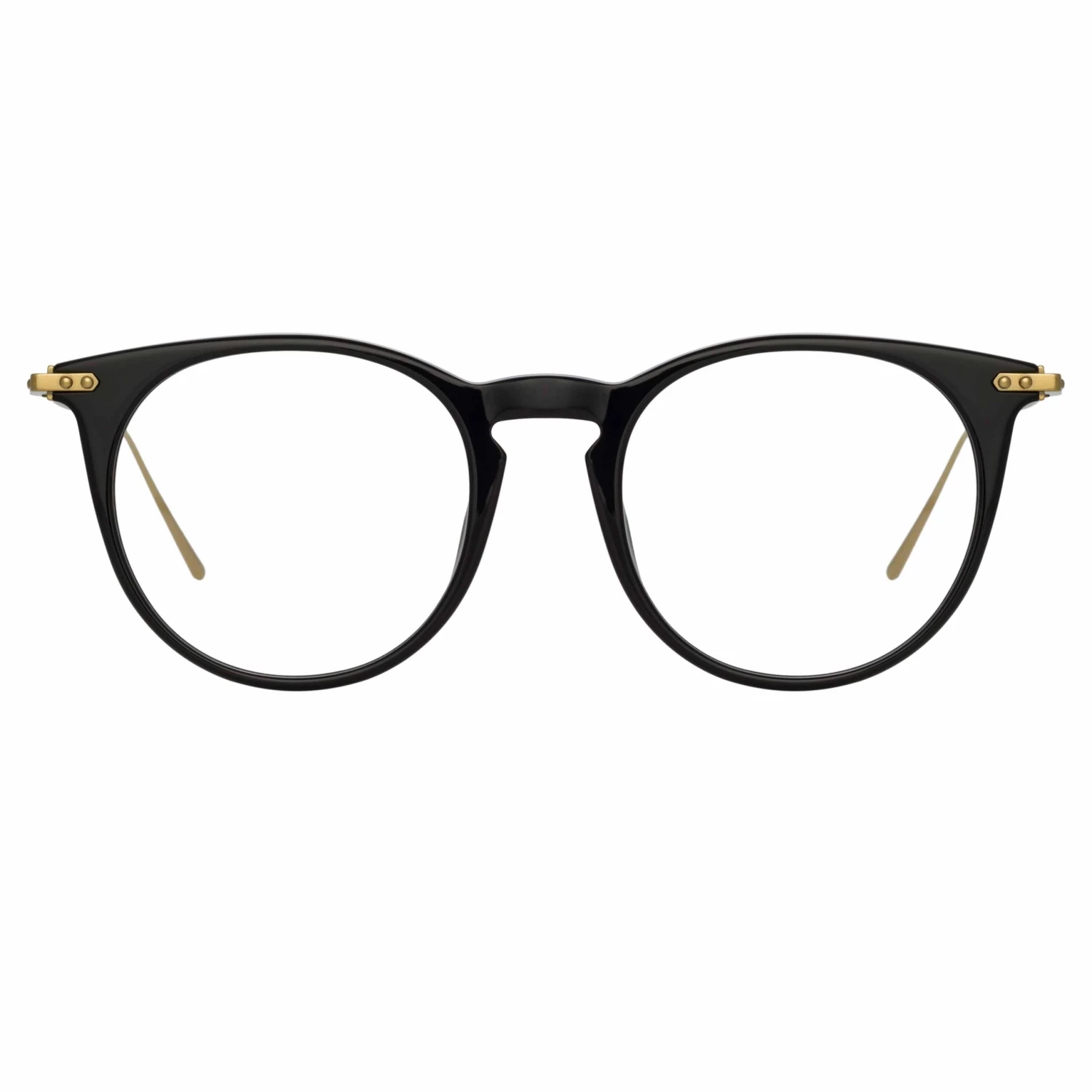 These oval optical frames from the LINDA FARROW Linear collection use a combination of highly polished acetate and 22 carat light gold plated titanium for an elevated finish. The Ellis frame is sculpted from recycled black acetate with laminated nose pads for comfort. Custom engineered gold plated hinges transition to delicate titanium temples for a lightweight yet durable finish. Discreet logo detailing at the brow and a gold plated linear line running along the side of the rim complete the frame. Also available in Asian fitting.