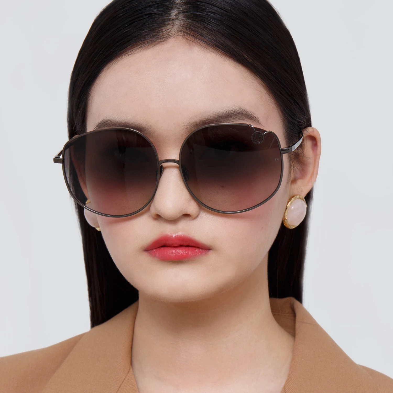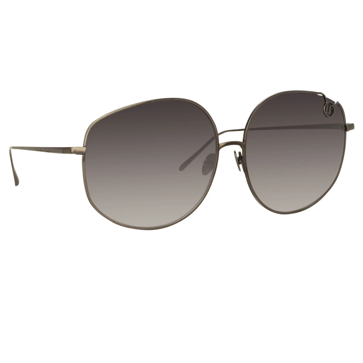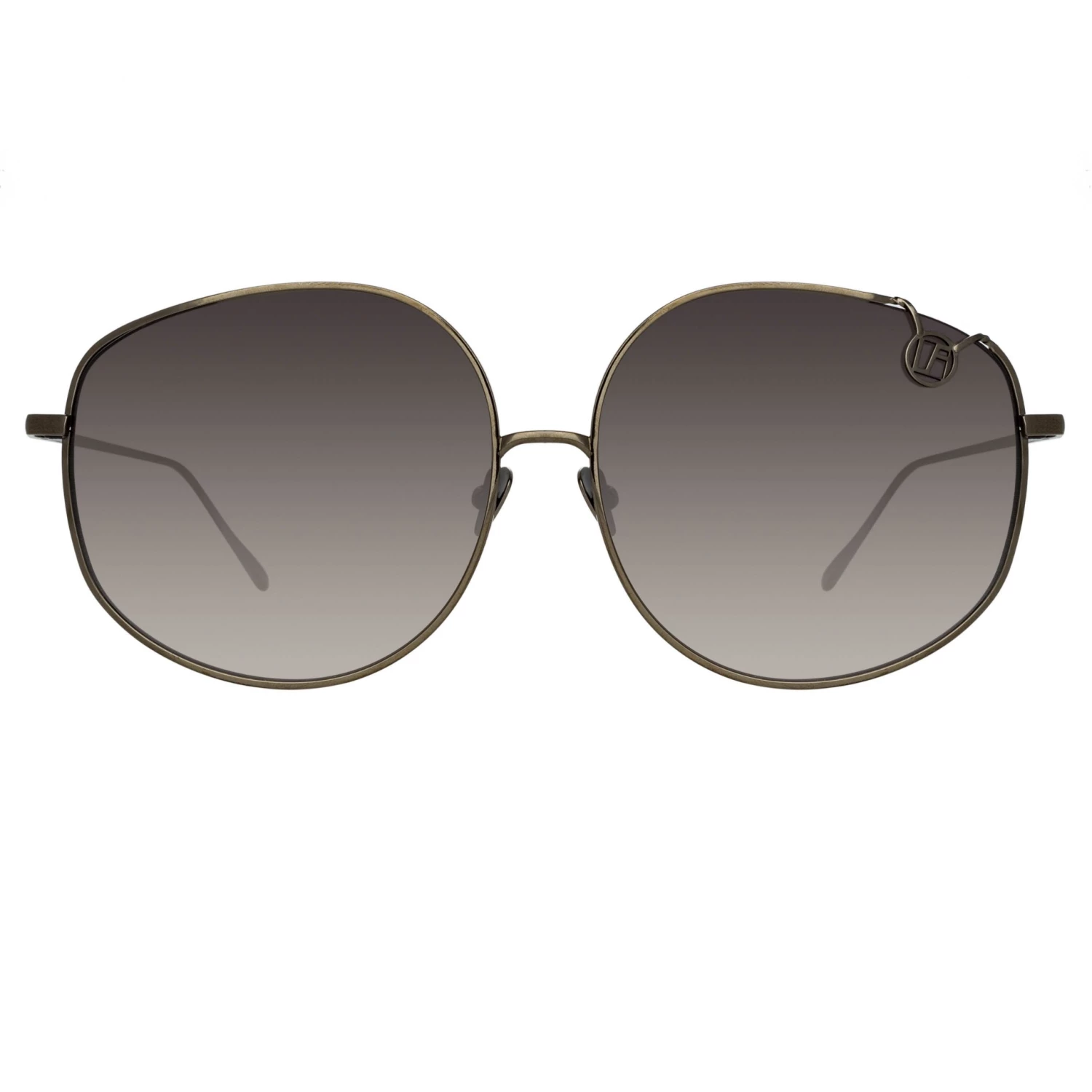 LINDA FARROW pays homage to its 1970’s heritage with this oversized silhouette. Crafted from pure Japanese titanium the finely outlined rim is finished with a statement folded monogram detail, exposing the lens edge. The 18 carat nickel gold plated frame is engineered with signature tapered temples and adjustable nose pads for superior comfort. The style is fitted with grey graduated lenses offering optimum clarity and UV protection.