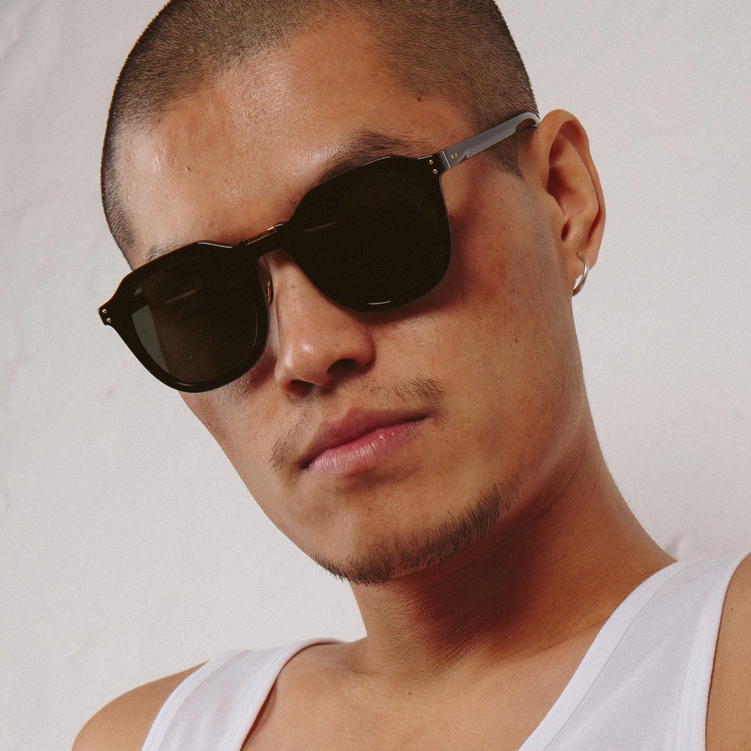 The Fletcher employs subtle detailing to elevate and add intrigue. The angular sunglasses are sculpted from recycled black acetate, facets leading to a squared titanium bridge detail. The 22 carat yellow gold plated accent carries subtle logos and flows into adjustable nose pads for a comfortable fit. The frame is fitted with solid grey ZEISS technology lenses which offer anti-glare and 100% UV protection. Beveled acetate temples are completed with rounded tips which carry yellow gold plated highlights.