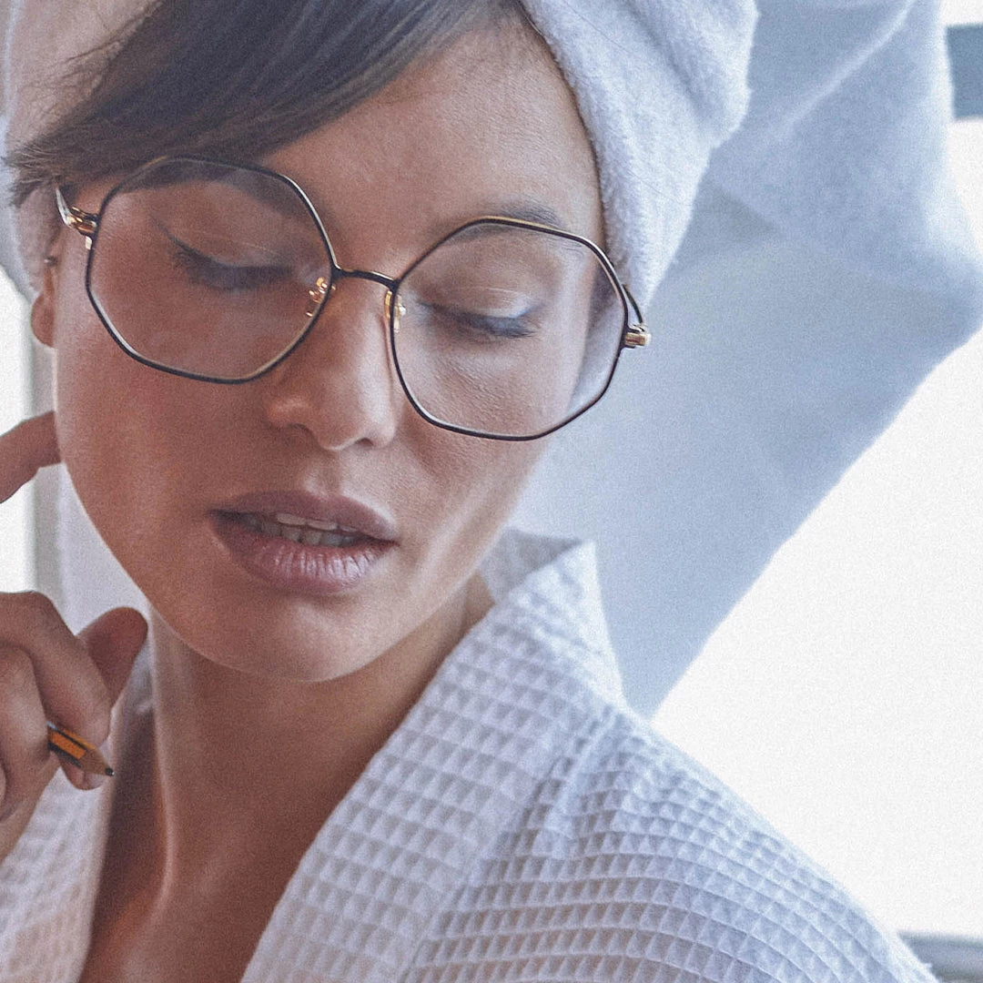 Leif celebrates the 1970s heritage of LINDA FARROW with its soft hexagonal silhouette and rich material combinations. The highly polished 22 carat yellow gold plated titanium is perfectly accented with a rounded black lacquer which brings a three dimensional high gloss finish to the frame front. The logo nose bridge transitions into adjustable nose pads for a comfortable fit. The optical glasses are completed with our signature tapered temple.