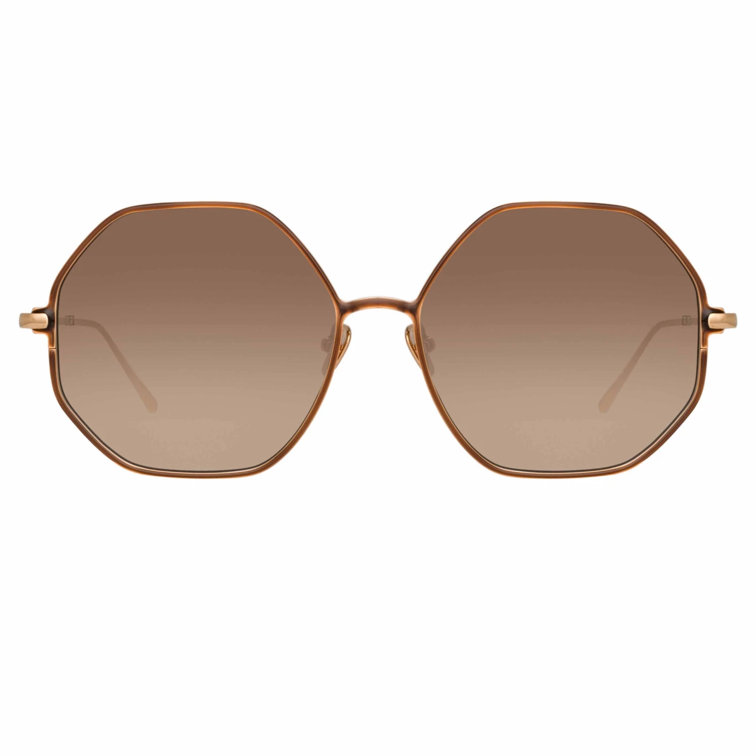 Leif celebrates the 1970s heritage of LINDA FARROW with its soft hexagonal silhouette and rich material combinations. The highly polished 18 carat rose gold plated titanium is perfectly accented with a rounded brown lacquer which brings a three dimensional high gloss finish to the frame front. The logo nose bridge transitions into adjustable nose pads for a comfortable fit. The style is fitted with brown graduated ZEISS technology lenses, chosen for their clarity, which offer anti-glare and 100% UV protection. The sunglasses are completed with our signature tapered temple.