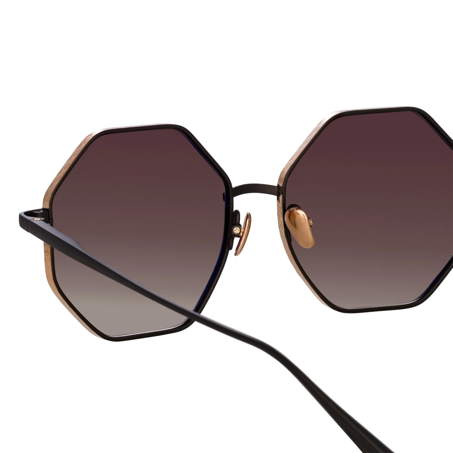 LINDA FARROW brings signature design language to this hexagonal silhouette. The Japanese titanium frame is coated in a matt black with a contrasting shiny 18 carat rose gold edge. The rim carries a delicately etched pattern inspired by elements in the natural world. Our signature temple graduates towards a concave detail temple tip engineered for ultimate comfort. The sunglasses are fitted with brown gradient ZEISS technology lenses which offer anti-glare and 100% UV protection. Completed with adjustable nose pads for a tailored fit.