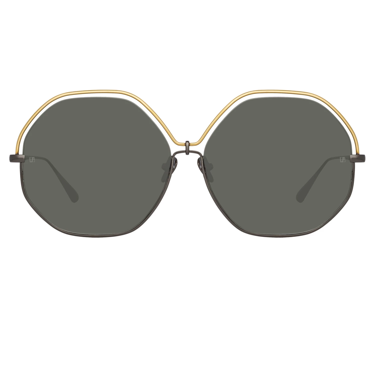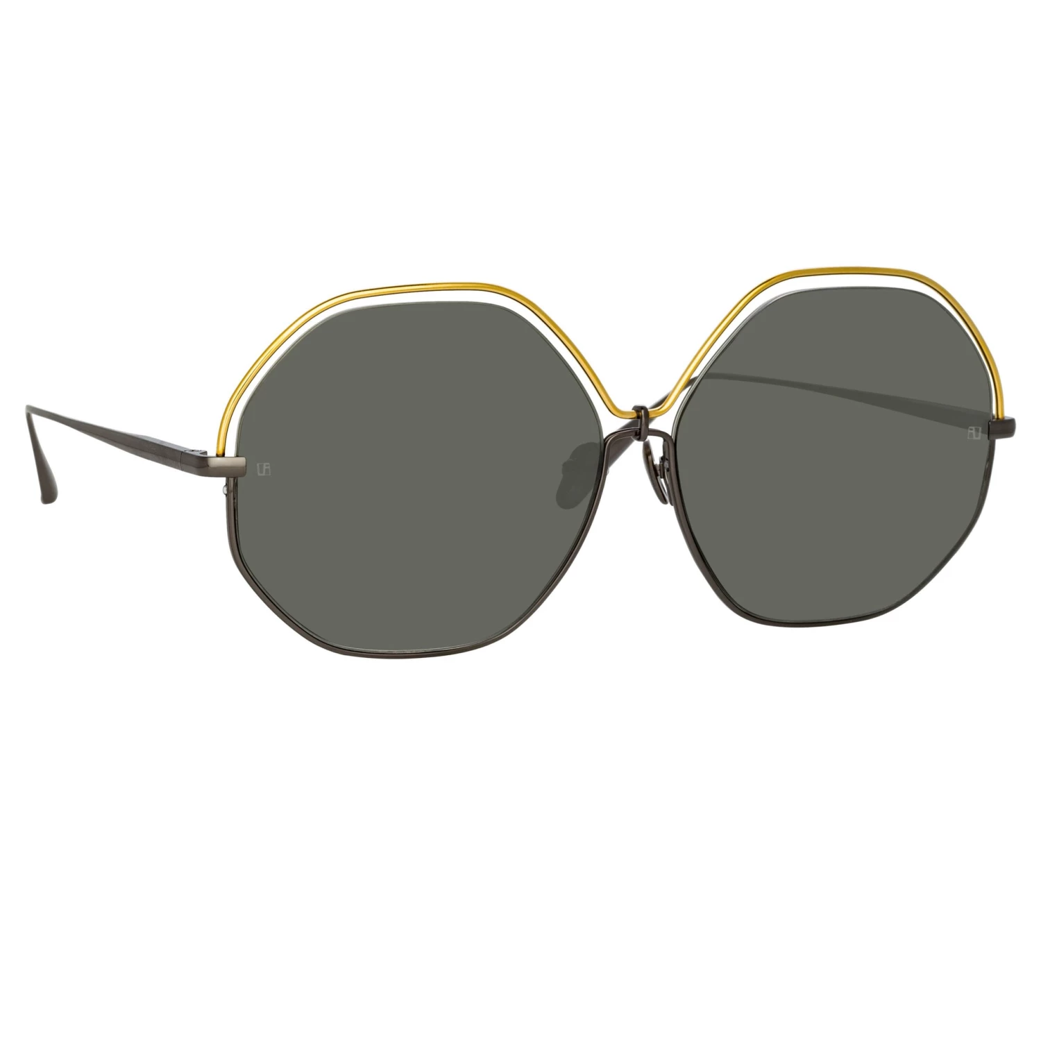 The Lorena sunglasses capture LINDA FARROW’s playful 1970s spirit with their oversized hexagonal form. Spun from fine Japanese titatnium, the 18 carat nickel gold frame encircles the lower half of the lens whilst leaving the upper edge exposed. A contrasting 22 carat yellow gold titanium brow echoes the shape of the silhouette but leaves negative space for an alluring finish. The frame is paired with adjustable nose pads and sleek tapered temples for a comfortable fit. Solid grey lenses offer anti-glare and 100% UV protection.