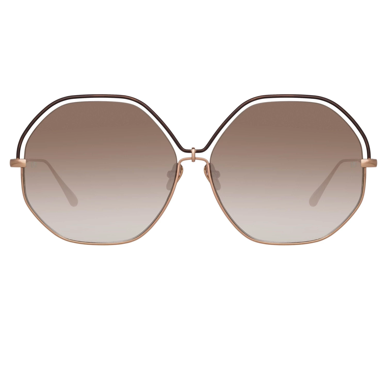 The Lorena sunglasses capture LINDA FARROW’s playful 1970s spirit with their oversized hexagonal form. Spun from fine Japanese titatnium, the 18 carat rose gold frame encircles the lower half of the lens whilst leaving the upper edge exposed. A contrasting matt brown painted titanium brow echoes the shape of the silhouette but leaves negative space for an alluring finish. The frame is paired with adjustable nose pads and sleek tapered temples for a comfortable fit. Softly graduated brown lenses offer anti-glare and 100% UV protection.