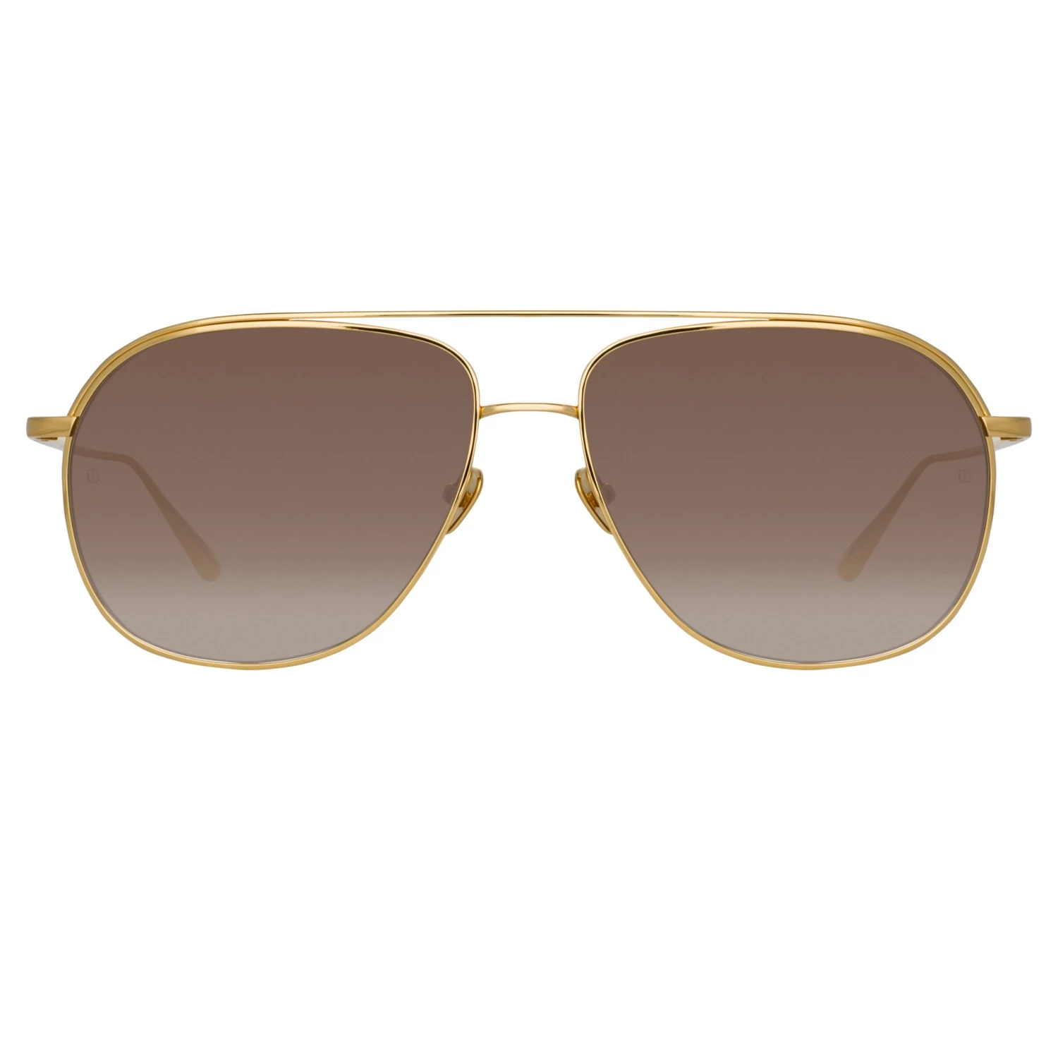 Elements of titanium are combined to create these soft square aviators from the LINDA FARROW collection. The 22 carat yellow gold plated frame carries fine black lines around the rim and layered top bar. Completed with our signauture graduated temples and adjustable nose pads for a comfortable fit. Fitted with brown graduated ZEISS technology lenses which offer anti-glare and 100% UV protection.
