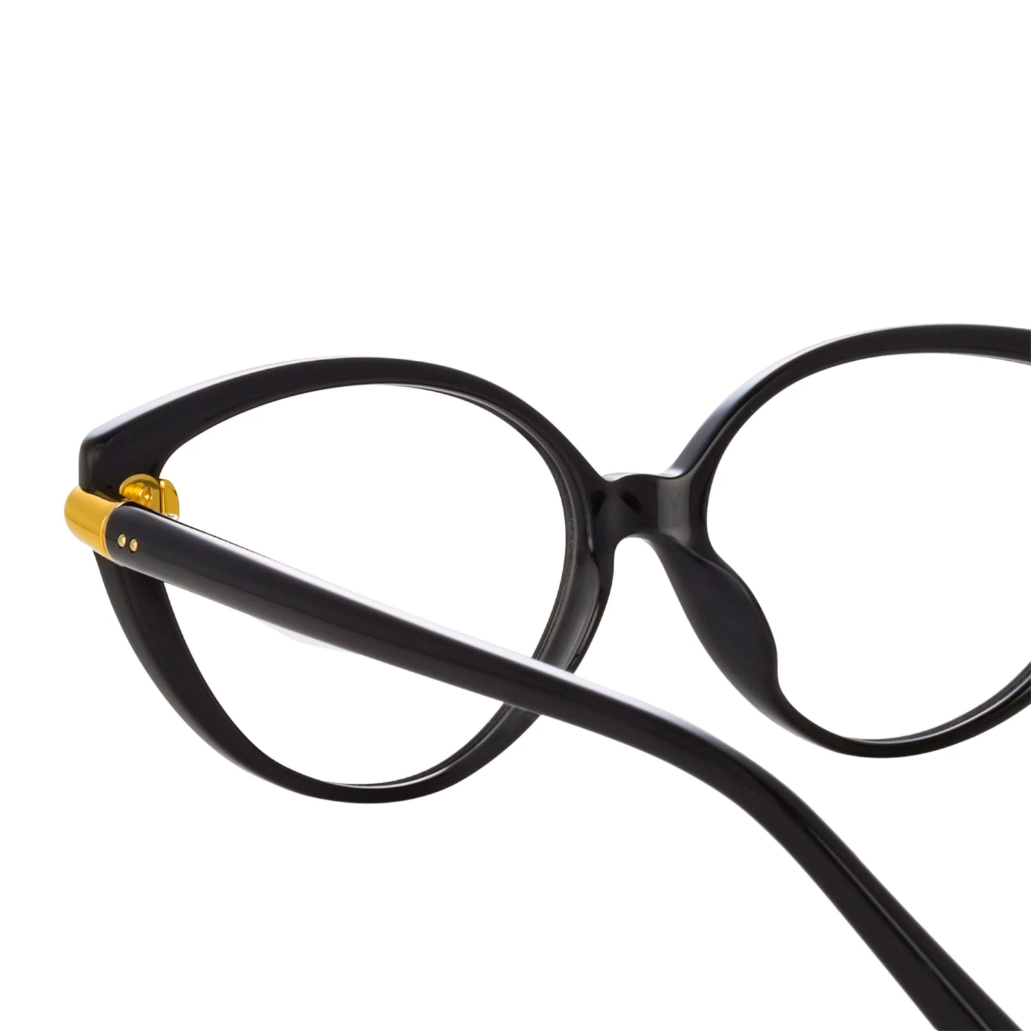 Hewn from recycled black acetate these glossy cat eye optical glasses are bold yet feminine. The lens carries a delicate cut away detail for the 22 carat yellow gold plated hardware to loop through and clasp the frame. The rounded temples feature sculpted tips for a comfortable fit.