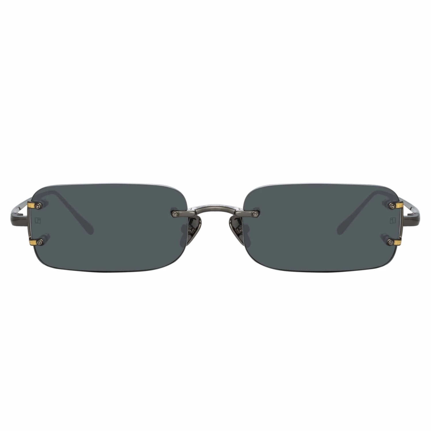 The Taylor sunglasses from the LINDA FARROW collection require a closer look. The solid grey rectangular lenses in this rimless silhouette are 3mm thick bringing added substance to the frame’s slim proportions. The glossy edged lens is clasped in place with and intricate temple setting which folds neatly along the outer edge. Engineered from 18 carat nickel gold plated titanium with contrasting yellow gold etching, the end piece transitions seamlessly into our signature tapered temple. The faceted nose bridge is engraved our logo and finished with adjustable nose pads for a comfortable fit.