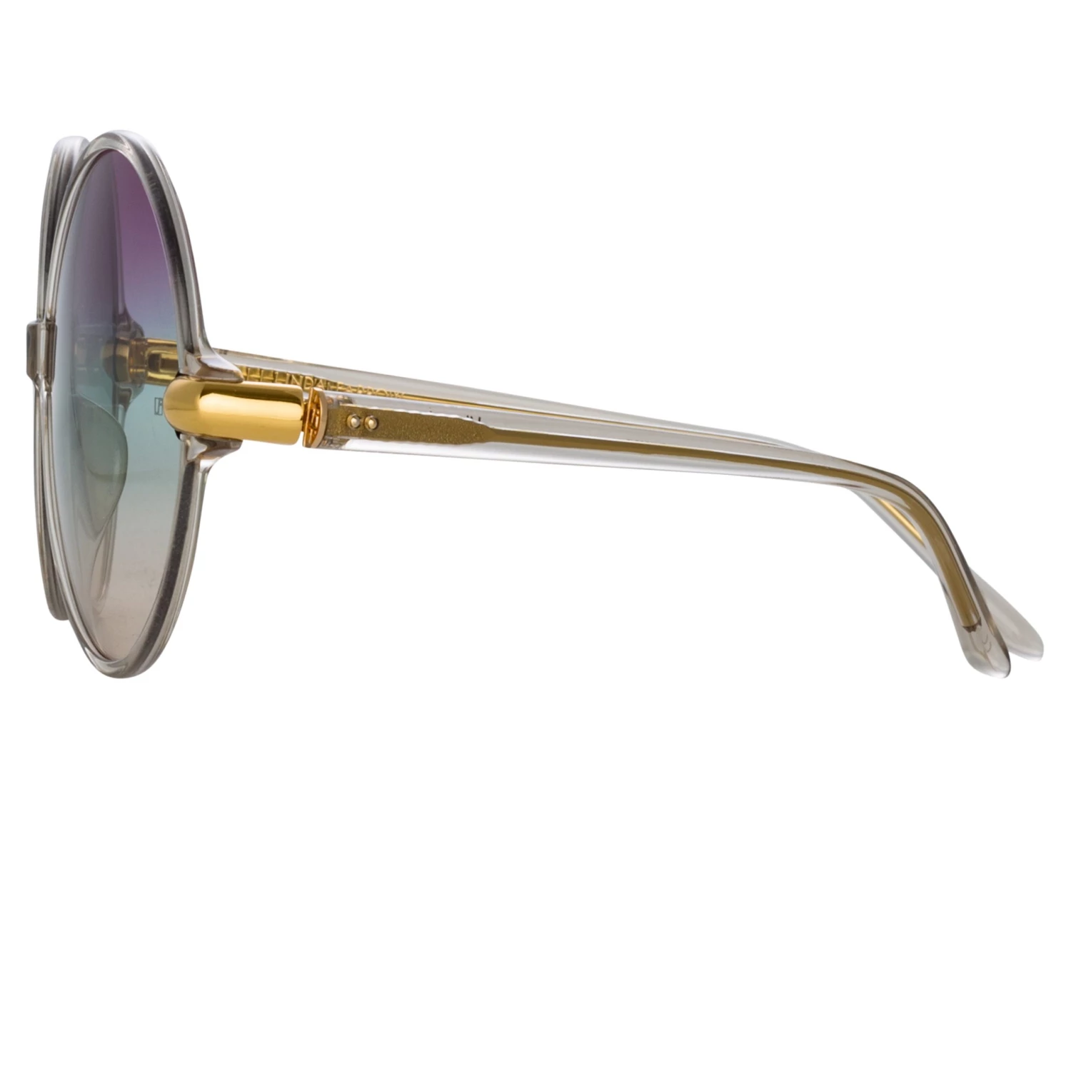 The LINDA FARROW Victoria sunglasses are oversized without feeling imposing. The round lenses are set into a fine truffle grey acetate rim. A rounded 22 carat yellow gold plated hardware detail cuts through the lens to clasp the frame, flowing into a rounded temple. Sculpted nose pads and temple tips provide comfort to the wearer. Completed with purple green graduated sunglass lenses which offer anti-glare and 100% UV protection.