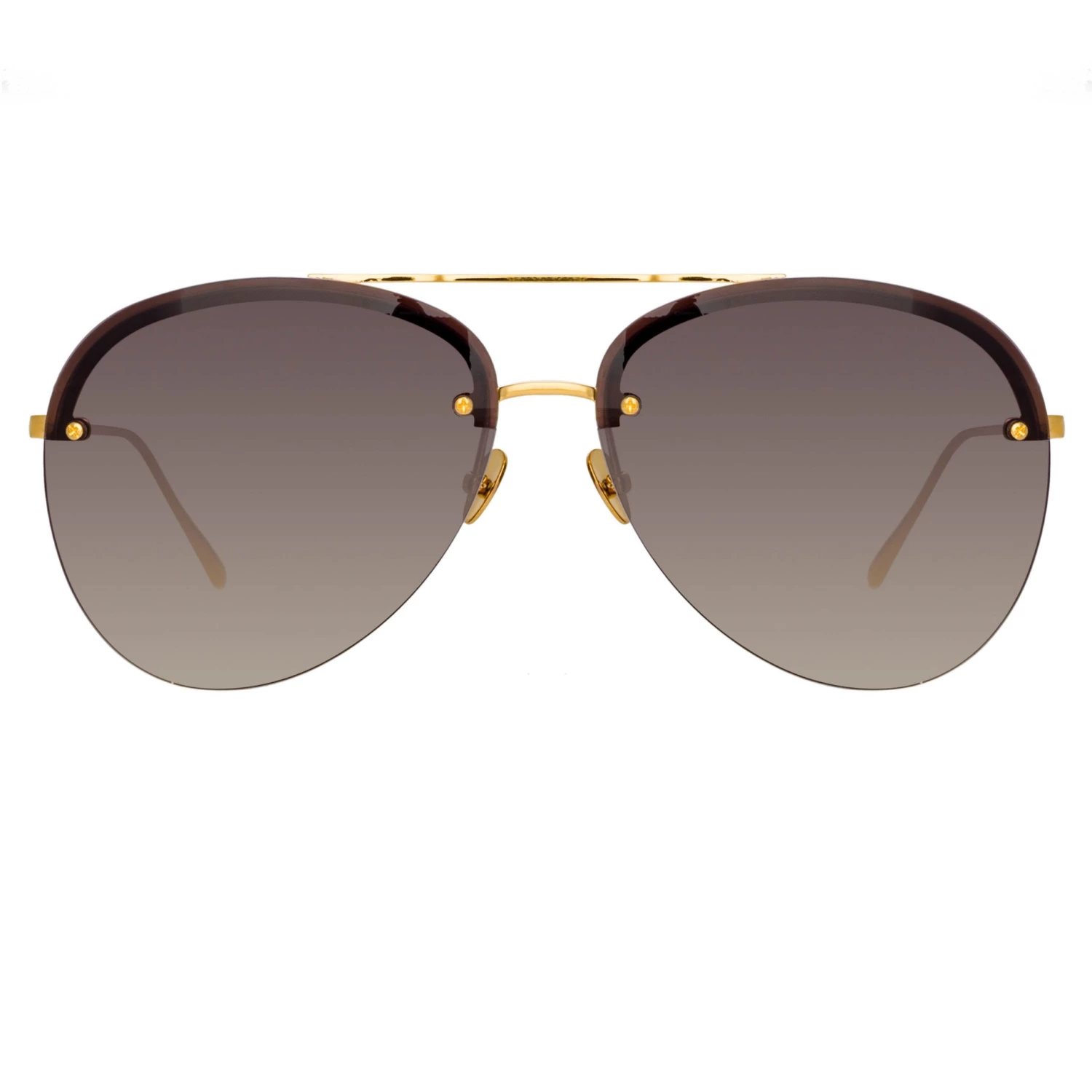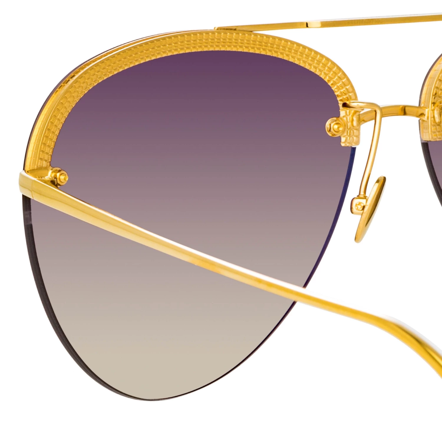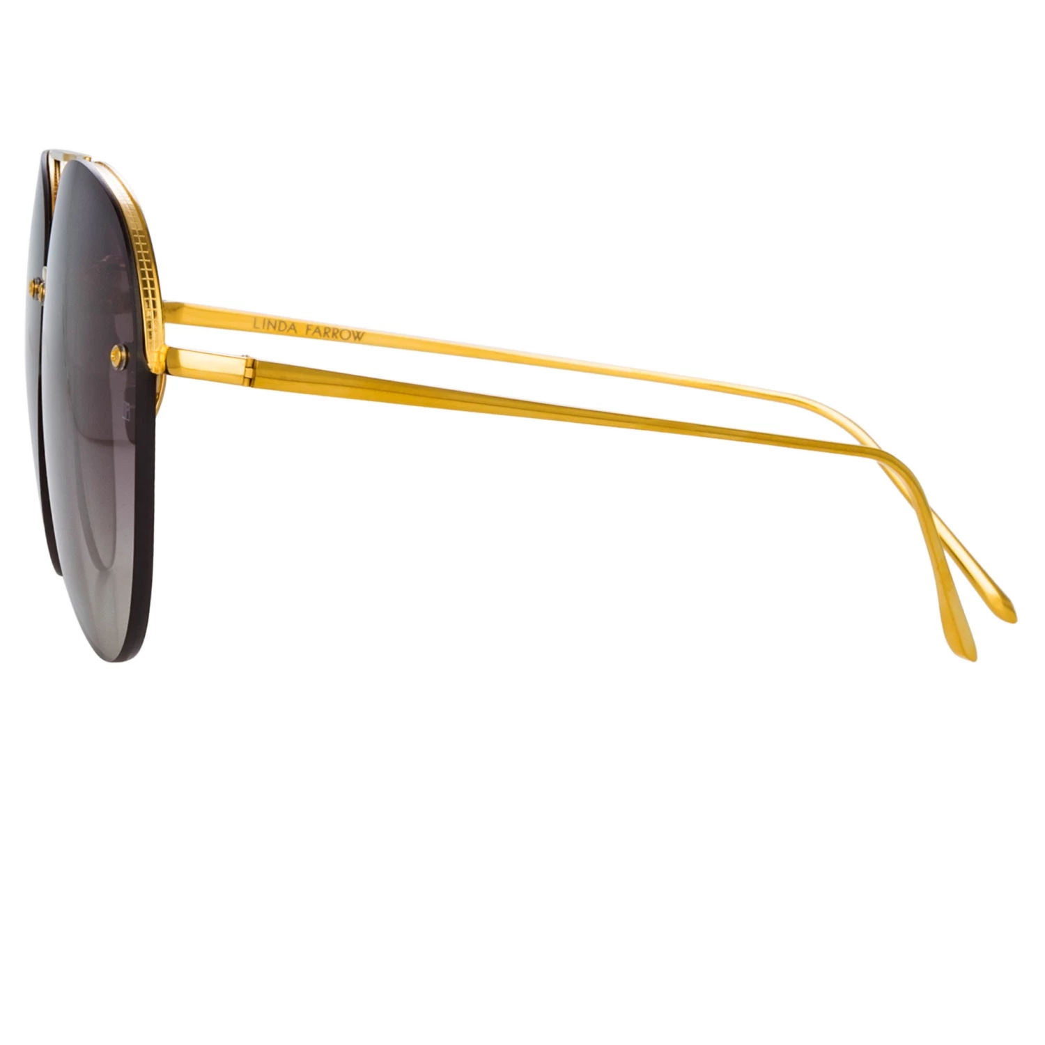 These classic rimless aviator sunglasses from the LINDA FARROW collection are all about attention to detail. The finely polished lens silhouette is mounted into a pure Japanese titanium framework, painstakingly engraved with a signature grid pattern. The 22 carat yellow gold plated frame is completed with sleep tapered temples, a custom aviator bar with discreet logo detailing and adjustable nose pads for a tailored fit. Grey graduated lenses offer optimum clarity and UV protection.