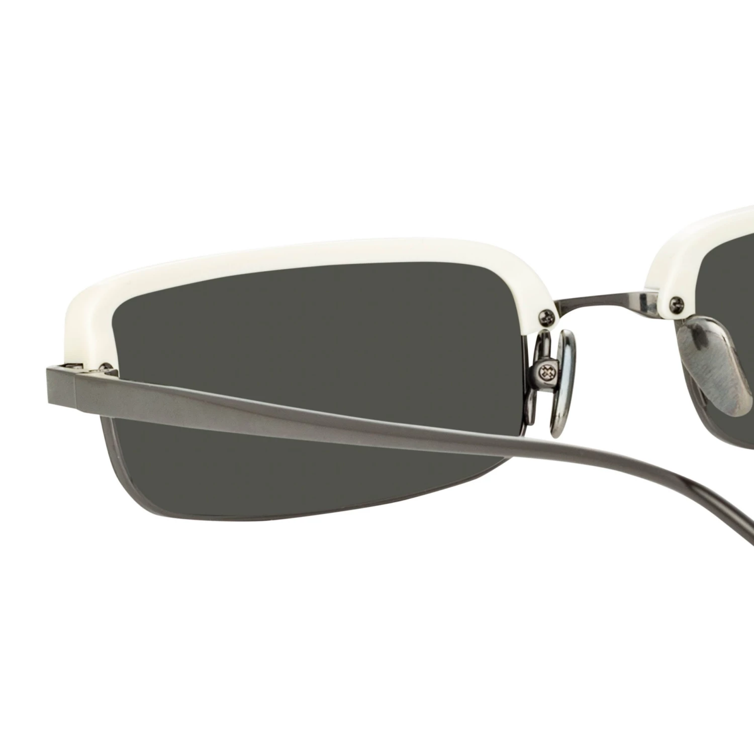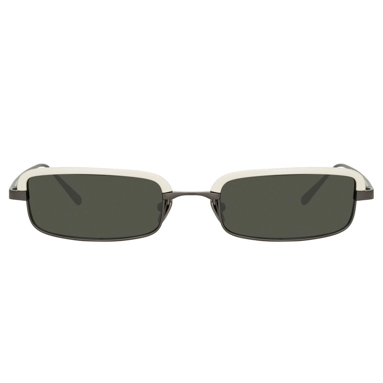 A striking combination of white acetate brows paired with an 18 carat nickel gold plated titanium form these rectangular silhouette sunglasses from the LINDA FARROW collection. The finely engineered frame runs into sleek tapered temples. Solid grey lenses harness ZEISS technology for optimum clarity and UV protection. The style is completed with adjustable nose pads for a tailored fit.
