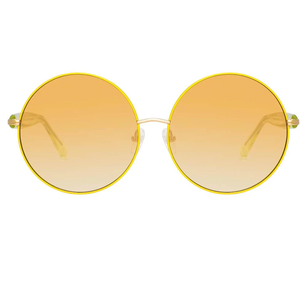 Renowned for its bold and vivacious use of colour and print, these round Posy sunglasses from our collaboration with Matthew Williamson showcase a yellow metal frame and yellow gradient lenses, complementing the light gold-toned hardware and yellow acetate temples.