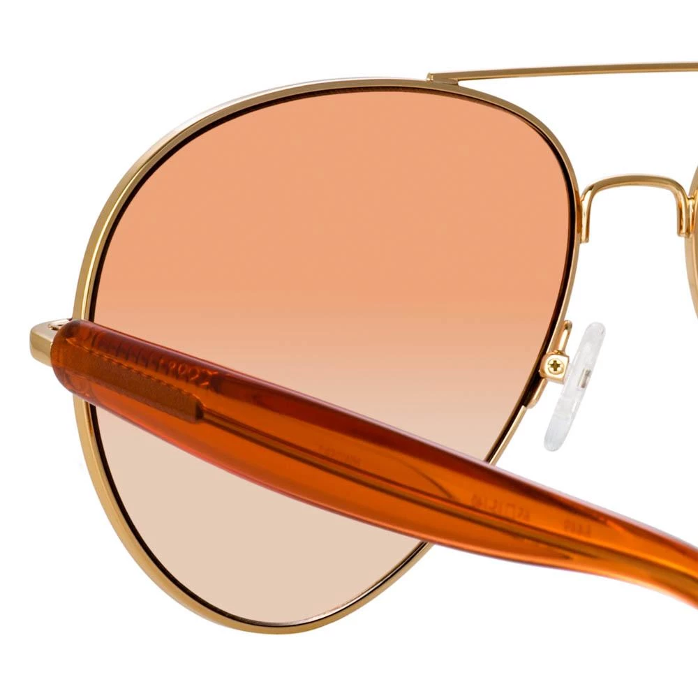 Coveted for his use of vibrant colours and spirited aesthetic, the Primrose from our collaboration with Matthew Williamson brings a subtle twist on classic aviators with a orange metal frame and orange gradient lenses, complementing the light gold-toned hardware and acetate temples.