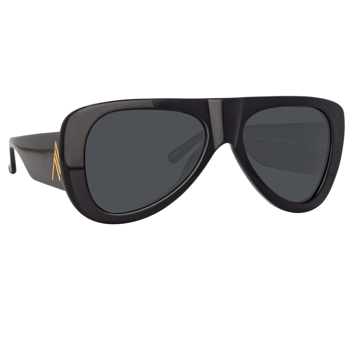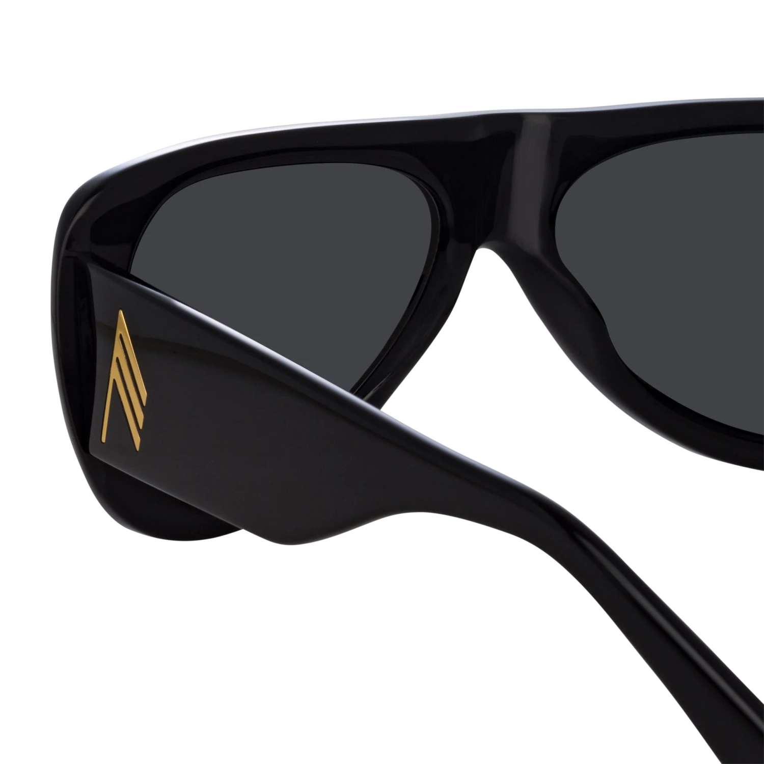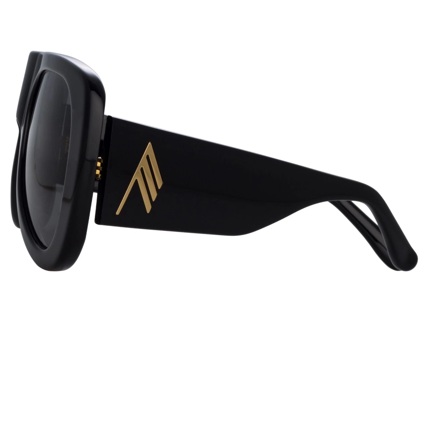 The statement of the season the Edie sunglasses from The Attico collection are an exploration of proportions. The oversized acetate aviators are sculpted from recycled black acetate, highly polished for a luxurious soft-edge finish. The wide temples carry the signature gold logo and solid grey lenses offer 100% UV protection. Sculpted nose pads and temple tips provide a comfortable fit.