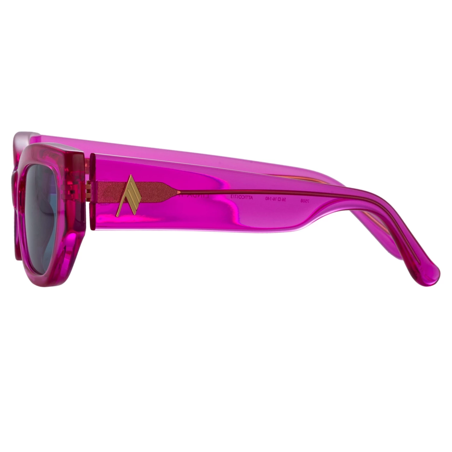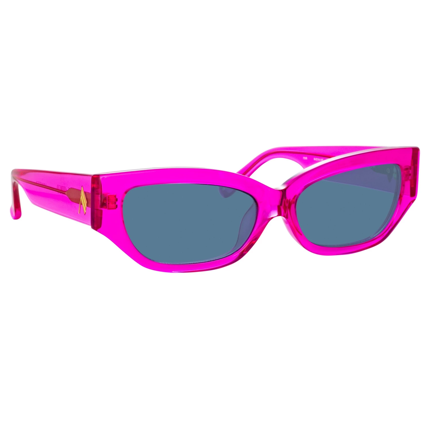 The Vanessa cat eye sunglasses are the latest style from our collaboration with Milan fashion house The Attico. The angled frames are sculpted from fuchsia Italian acetate and hand polished to achieve a high shine. Temples are detailed with gold branding and solid blue lenses offer 100% UV protection. Sculpted nose pads and temple tips ensure a comfortable fit.